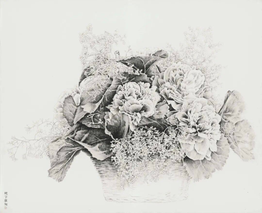 在三幅以牡丹为材的作品中,艺术家通过使用西方古典素描技法、写意技法、工笔技法以及南宋山水技法,创造了柔和而又饱满的花朵形象。选用正面的角度,在表现牡丹花瓣复杂的结构